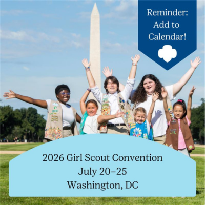 Girl Scouts from across our country and around the world will gather to conduct the important business of our movement, using our democratic process to do so. The 2026 Girl Scout Convention will be taking place July 20–25, in Washington, DC.